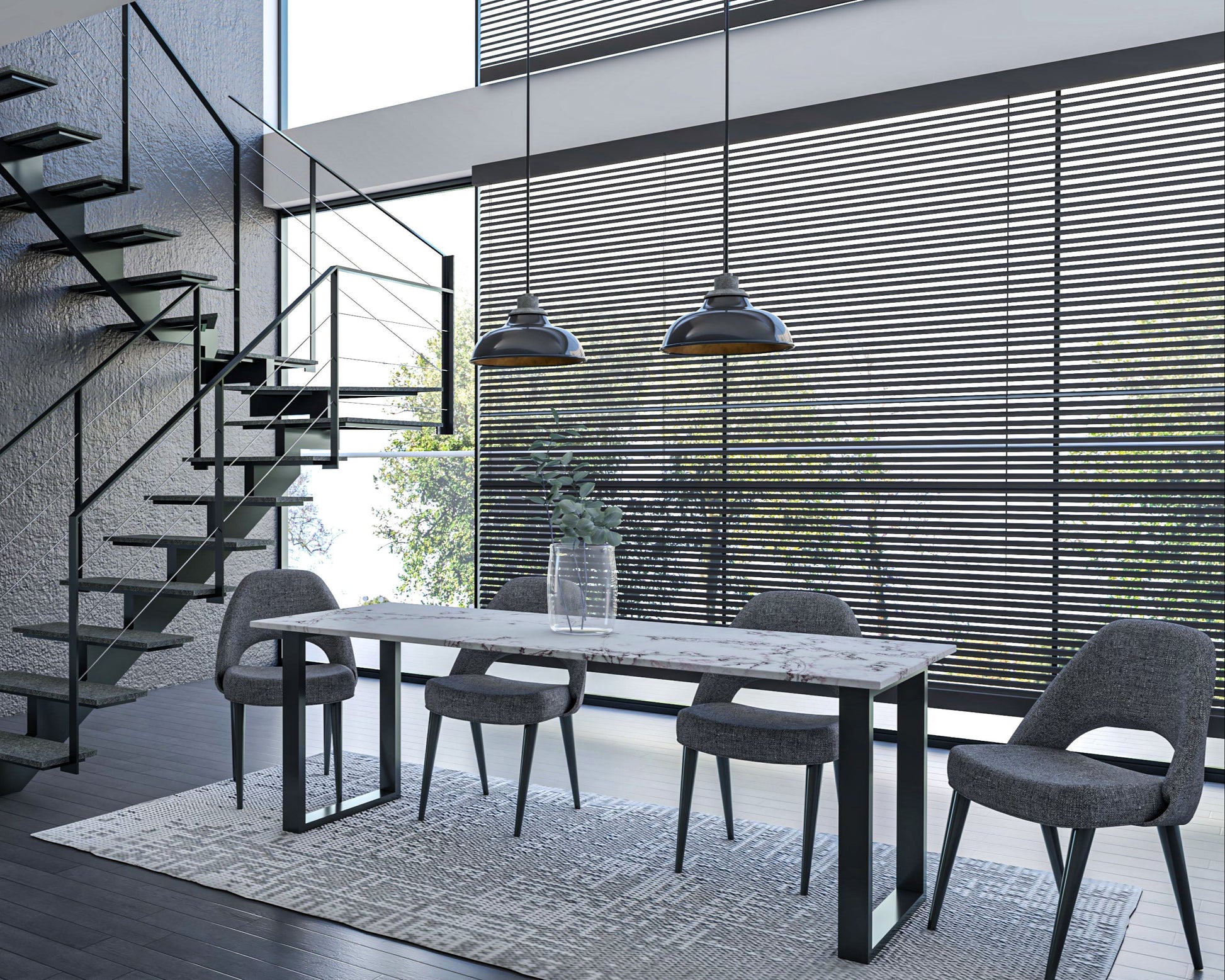 The Carvello Dining Table is crafted with a balance of style and function. Shown here in quartz, it is also available in porcelain ceramic and terrazzo marble, offering a choice of finishes to complement different interiors.